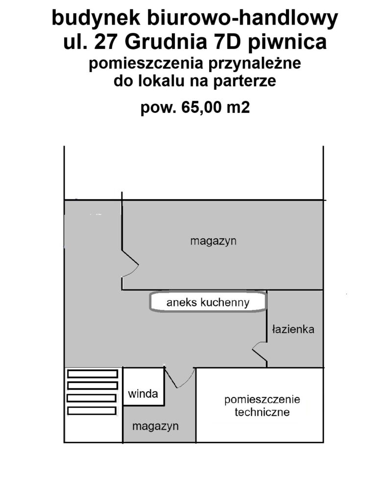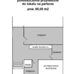 1. Parter lokal handlowy o pow. 115,00 m2 składający się z powierzchni handlowej, biura toalety plus 65,00 m2 pomieszczeń na poziomie -1 tj. łazienka, kuchnia, magazyn: