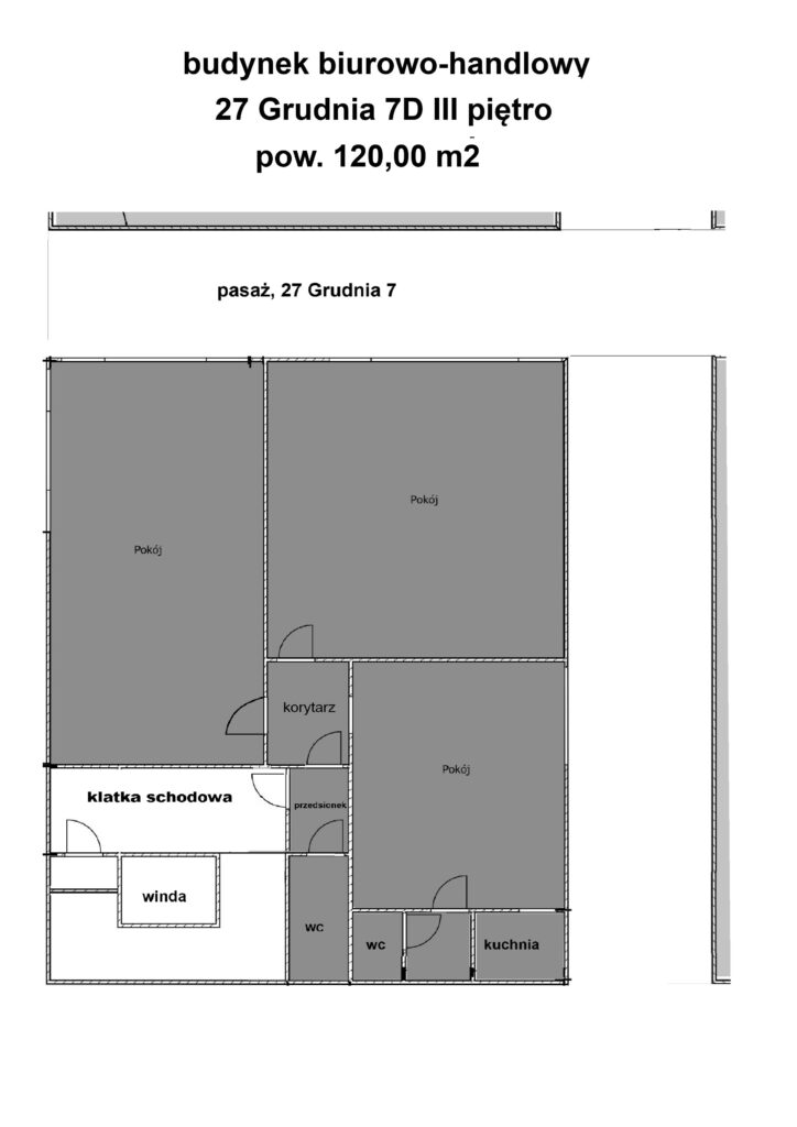 1.  III piętro powierzchnia biurowa około 120,00 m2 składająca się z trzech przestronnych pokoi, umeblowanej kuchni, dwóch toalet, holu i korytarza: